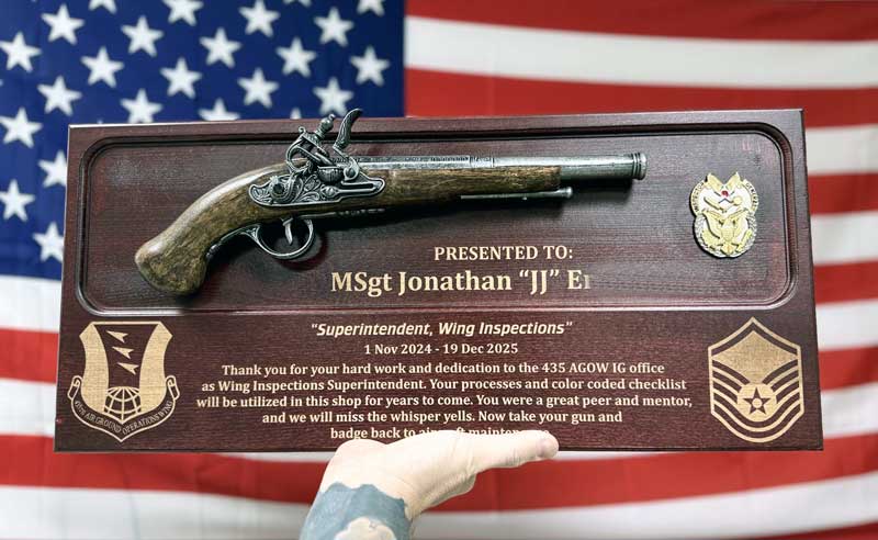 Pistol Plaque 435 AGOW USAFE MSgt E7 Gift by Trophy Center KL Mr. & Mrs. Kulbick | Trophy Shop | Engraving Shop | ONLY in Kaiserslautern-Einsiedlerhof underneath Hacienda Mexican Restaurant | 2 MILES FROM RAMSTEIN AIR BASE | Going Away Gifts | PCS Awards | Engraved Etched Custom Made Coin Challenge Coins Stamps Guidons Awards Plaques USAREUR-AF | USAFE AFAFRICA | EUCOM | AFRICOM | MARFOREUR | GPC Card Accepted | 889 Document available | WE ARE NOT AFFILIATED WITH ANY STORES ON BASE OR SOMEWHERE ELSE | ONLY in K-TOWN | We Are Awesome | E-Mail: info@trophy-center.de